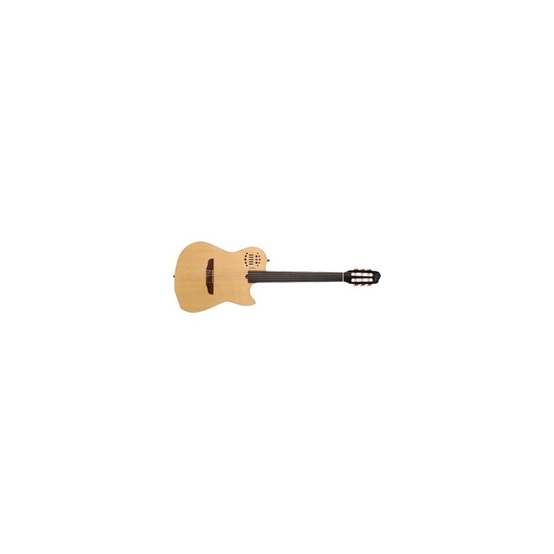 Godin MultiAc Nylon SA Fretless Natural HG Fretless.Cuerpo: Caoba con cámara de aire y tapa de, Abeto, Mástil: Caoba (escala 25%”, radio 16", cejilla 1,9"), Diapasón: Ébano fretless, Electrónica: Transductor acústico RMC en puente,, salida MIDI 13 pin