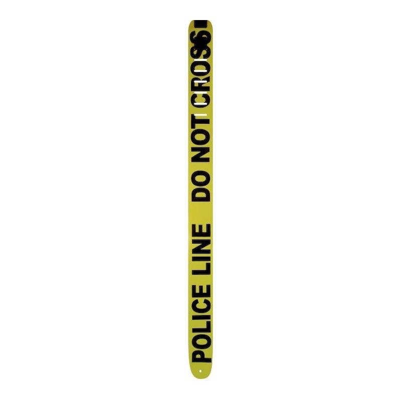 Correa de guitarra con diseño de cinta policia de no pasar, colo amarilla con letras en negra.
