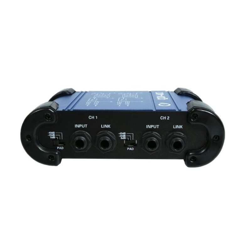 Caja de inyección mono pasiva. Entradas ¼ y XLR input. Salida XLR . Interruptor de toma a tierra (Ground Lift).Atenuador Pad Switch (0dB & -20dB & -40dB).