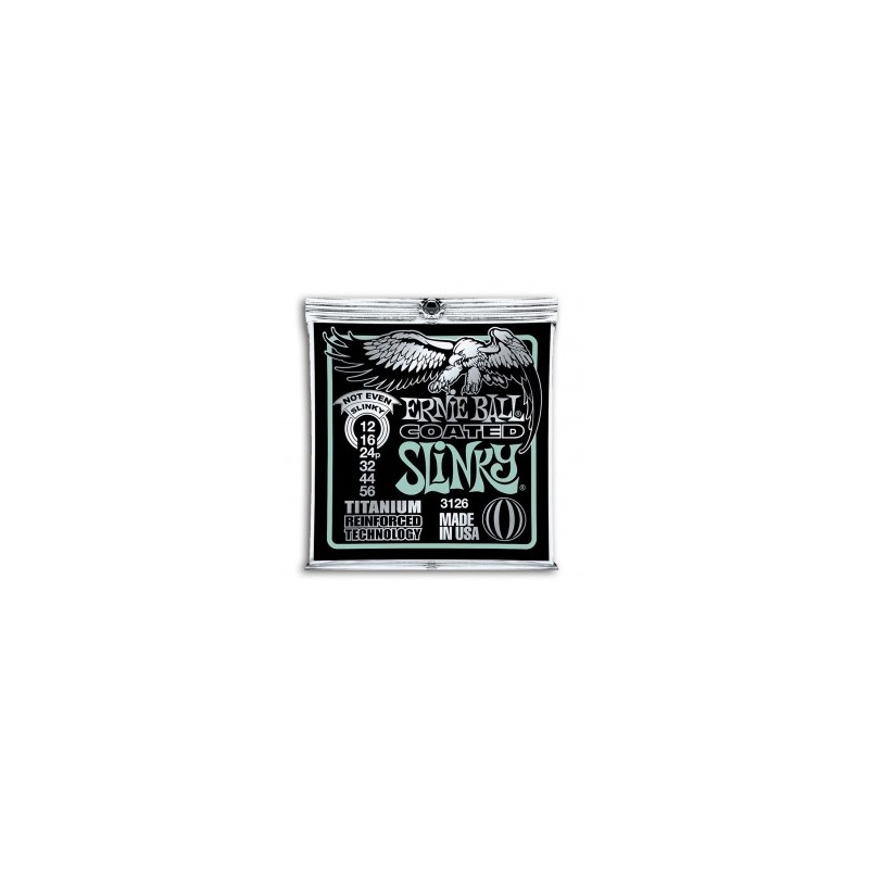 Juego de cuerdas. Calibre .012 .016 .024 .032 .044 .056 **Óptimas para Afinaciones Bajas**. Las cuerdas Ernie Ball Coated combinan lo último en tecnología aplicada en la fabricación de las cuerdas. Caracterizadas por la aplicación de una microcapa de esmalte que previene el debilitamiento y la corrosión multiplicando por cinco su durabilidad con respecto a las estándares, las cuerdas Coated Titanium han sido reforzadas con un entorchado de titanio en la base inicial que nos estabilizará l