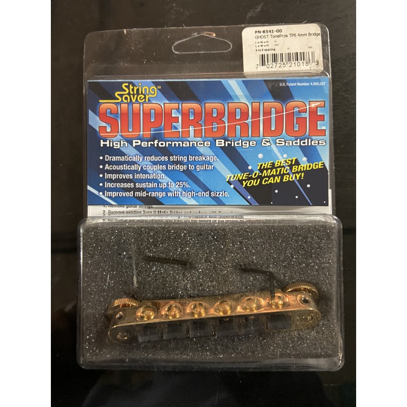 Puente Tune-o-matic Ghost Tonepros Tpfp. Tornillo de anclaje de 6mm. Con piezos. Acabado GOLD.