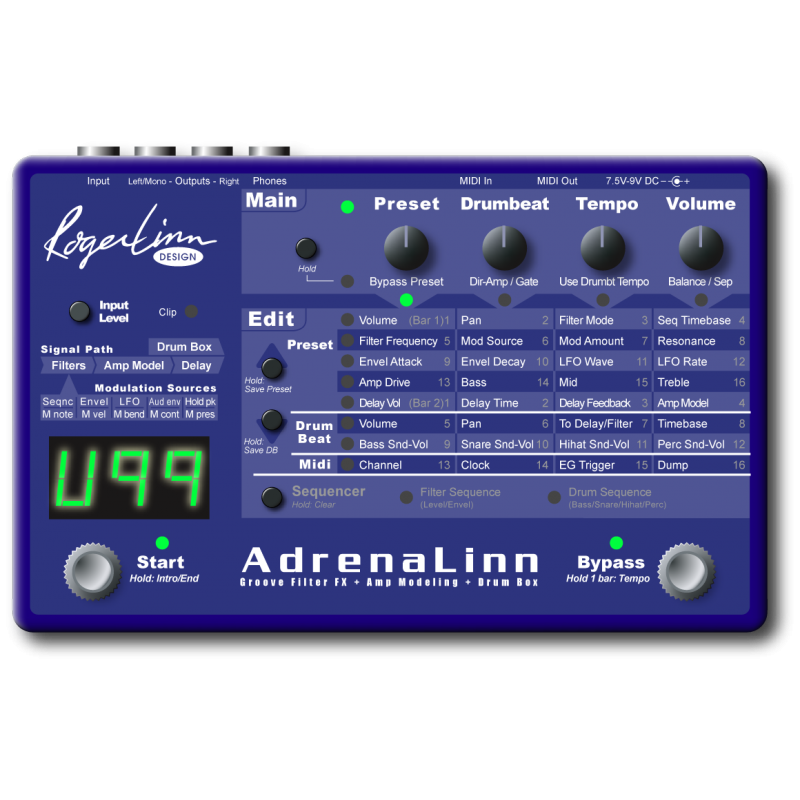 El AdrenaLinn es esencialmente un procesador de efectos con entrada mono y salida estéreo en formato stomp-box, pero es inusual porque incluye una caja de ritmos simple basada en compases de dos compases, un amplificador de guitarra de modelado del tipo que ahora todos conocemos. familiarizado con y una sección de filtro impulsada por secuenciador con hasta 32 pasos que pueden funcionar en sincronización con la caja de ritmos. Alternativamente, toda la máquina puede bloquearse en MIDI Clock para una integración completa con un secuenciador MIDI. Aunque es posible crear efectos de filtro tradicionales como wah y flange, la verdadera razón de la existencia de AdrenaLinn es su capacidad para crear tratamientos de filtro rítmicos escalonados. Los efectos que se ofrecen incluyen sonidos de estilo de muestreo y retención de sintetizador, patrones de trémolo rítmico y patrones de brida afinados que seleccionan una escala musical de cualquier entrada de amplio espectro, incluida la percusión y otros tratamientos rítmicos.5 tonos esenciales y ajustables de guitarra, que van desde cristalina limpia al abrasador distorsión de alta ganancia, basado en amplificadores de guitarra codiciados mas efectos.