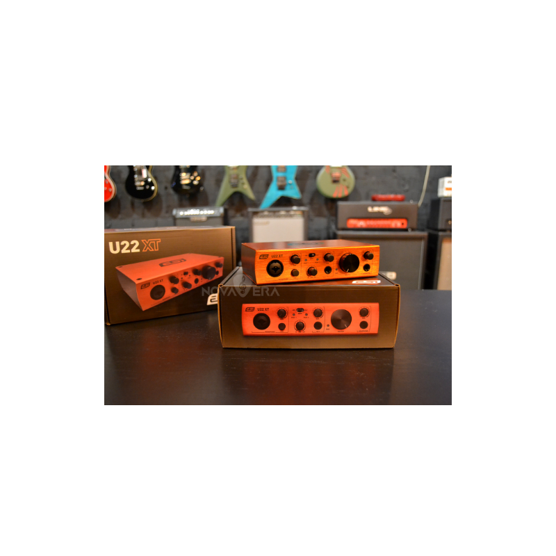 El U22 XT ofrece total flexibilidad como dispositivo USB con calidad de audio profesional de 24 bits. Dispone de 2 canales de entrada analógica y 2 canales de salida analógica con conexión RCA, un preamplificador de micrófono con entrada XLR y alimentación fantasma de +48V, una entrada de instrumento Hi-Z para guitarras, un amplificador de auriculares de alta calidad y salidas de jack.