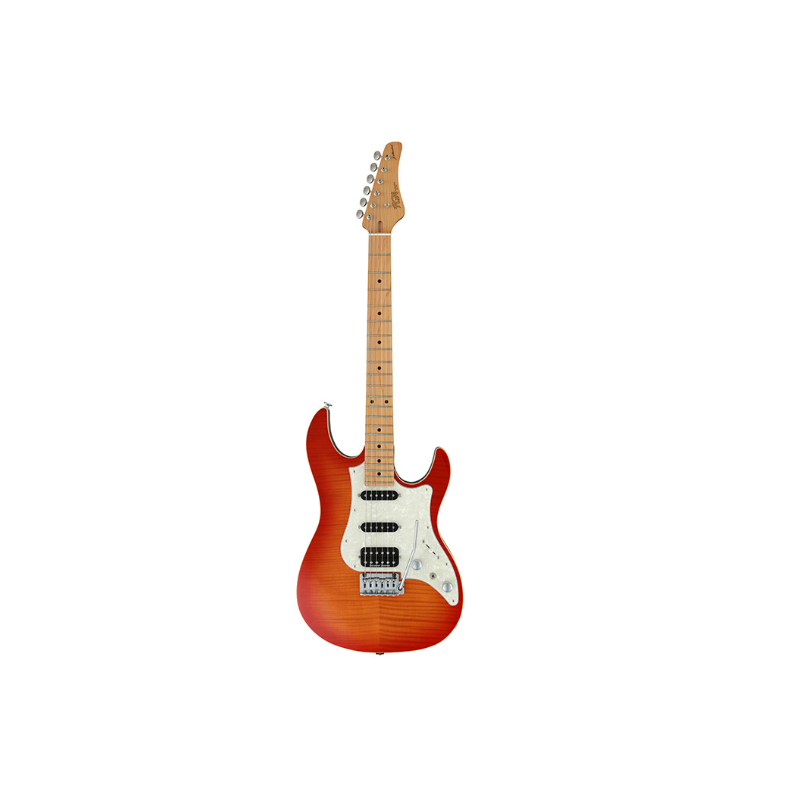 FUJIGEN JOS-FM-M-FBT. Guitarra eléctrica de la serie Odissey con cuerpo tipo Stratocaster de tilo con tapa de arce flameado y configuración de pastillas HSS. Color: Fire burst. Incluye funda.