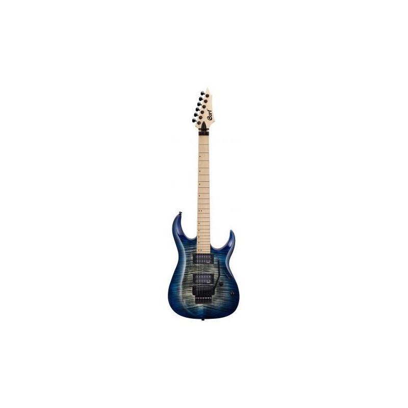 GUITARRA ELECTRICA CUERPO MACIZO Guitarra eléctrica de diseño moderno de doble cutaway. Cuerpo de tilo americano con tapa de arce flamed. Mástil de arce con diapasón de arce. Clavijero diecast. Vibrato con bloqueo Double Locking II.Pastillas EMG SRO OC1 (pasivas, con imán de Alnico V), configuración HH. 1 volumen, 1 tono y switchde 3 posiciones. Herrajes en negro. Acabado en Blue Burst transparente.