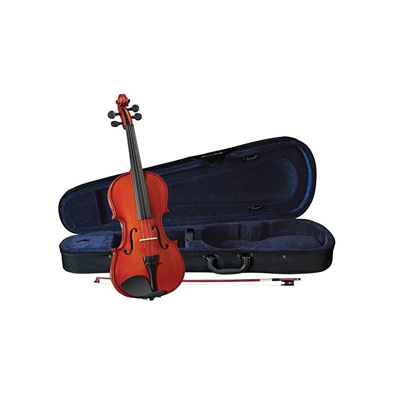 Violín Serie Maestro. Tapa de pícea sólida seleccionada, tallada y graduada a mano, Fondo (1 pieza) y aros combinados de arce flameado, Ribeteado incrustado en ébano, Diapasón, saddle y cejilla de ébano, Arco en madera del Brasil, Estuche de suspensión